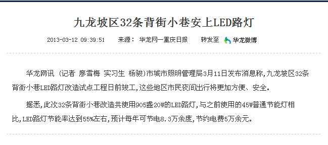 Congratulations from Chongqing City Lighting Management Bureau to organize, our R & D and manufacturing of "ten Hui card" Beijiexiaoxiang integration easy disassembly LED special energy-saving lamps "Jiulongpo Beijiexiaoxiang energy-saving pilot project successfully completed (case - outdoor lighting energy-saving http://m.shemalechatlines.net/gongchengshishianli/shiwailvsezhaomingjienenggaizaoanli/2013-10-14/16.html). Please see the Hualong network and Chongqing City Lighting Management Bureau Maintenance Management Office published the "dynamic Jiulongpo 32 Beijiexiaoxiang LED street reconstruction":