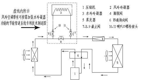 This patented technology, as a result of the installation of water cooling condenser energy saving piping system in the traditional air cooling air conditioning system, has the advantages of strong adaptability and easy assembly and disassembly. The utility model can increase the refrigerating heating power by 30%, and at the same time reduce the work current by about 30%. Working principle: two stage structure is formed through condensation condensation and air-cooled condensing water cooled condenser, can effectively solve the traditional air conditioning single air-cooled condensation mode result in condensation of high pressure, high temperature refrigerant compressor, heavy load, high temperature, abrasion, high noise, high energy consumption and low efficiency of cooling problems.