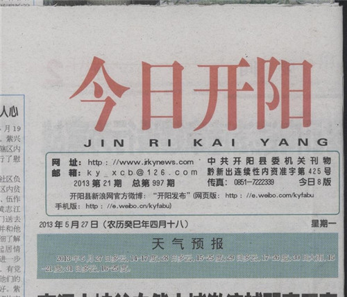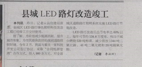 熱烈祝賀我司實施改造的貴州省開陽縣縣城LED路燈工程提前竣工完成,并已交付使用。2013年5月27日貴州省開陽縣《今日開陽》報進(jìn)行了報道,現(xiàn)將全文轉(zhuǎn)載如下: