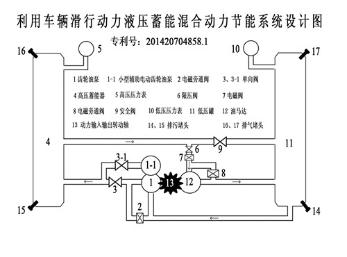 一、一種利用車輛滑行動(dòng)力液壓蓄能混合動(dòng)力節(jié)能系統(tǒng)工作原理 (專利號(hào):201420704858.1)