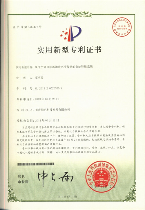 此專利技術(shù)由于在傳統(tǒng)風(fēng)冷空調(diào)中任意加裝水冷冷凝器節(jié)能管道系統(tǒng),因而適應(yīng)性強(qiáng),拆裝方便,可提高制冷制熱功率30%,同時(shí)降低工作電流30%左右。工作原理:通過風(fēng)冷冷凝及水冷冷凝形成雙級(jí)冷凝的冷凝結(jié)構(gòu),能有效解決傳統(tǒng)風(fēng)冷空調(diào)單一采用風(fēng)冷冷凝方式導(dǎo)致冷凝壓力高、制冷劑溫度高、壓縮機(jī)負(fù)荷較重、溫度高、磨損大、噪聲大、能耗高、制冷效率低的問題。