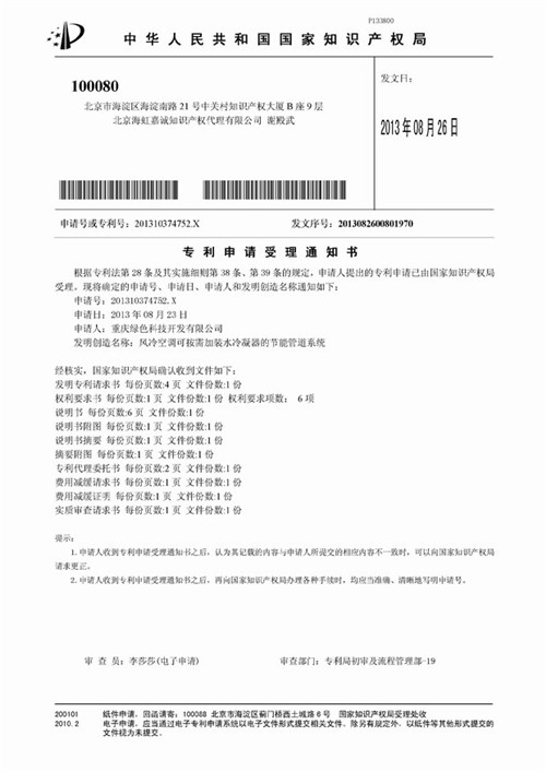 2. 風(fēng)冷空調(diào)可按需加裝水冷凝器的節(jié)能管道系統(tǒng)《專利申請(qǐng)受理通知書》(發(fā)明專利)復(fù)印件