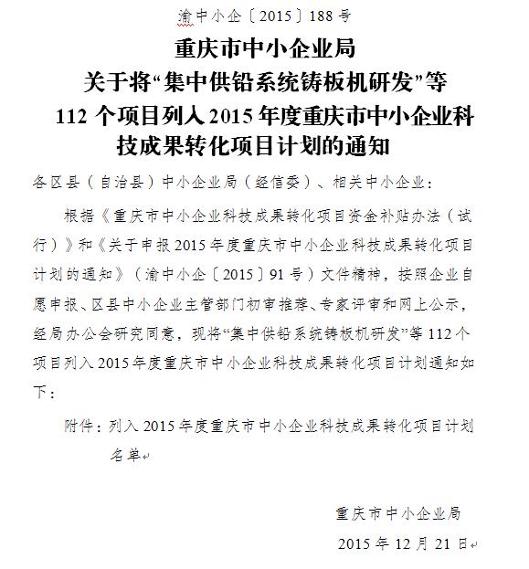 多年以來,重慶城建經濟(集團)重慶綠色科技開發(fā)有限公司與重慶房地產職業(yè)學院進行產學研合作,堅持創(chuàng)新發(fā)展,研發(fā)了“中國創(chuàng)造”“互聯(lián)網+多色溫防霧霾亮度可調智能控制系統(tǒng)及LED智能燈具”技術。該技術自2015年7月22日申報2015年度重慶市中小企業(yè)科技成果轉化項目計劃后,現(xiàn)已于2015年12月21日成功列入科技成果轉化項目計劃。通知文件如下: