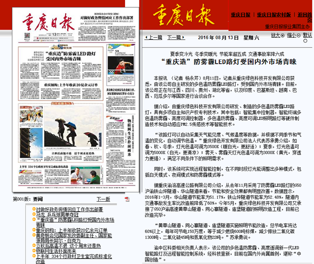 熱烈慶祝我司利用自主知識(shí)產(chǎn)權(quán)研發(fā)制造的“中國(guó)創(chuàng)造”“互聯(lián)網(wǎng)+”多色溫防霧霾、亮度遠(yuǎn)程智能遙調(diào)新一代LED路燈產(chǎn)品及控制系統(tǒng)在重慶日?qǐng)?bào)《創(chuàng)新驅(qū)動(dòng)促發(fā)展》欄目頭版頭條宣傳報(bào)道
