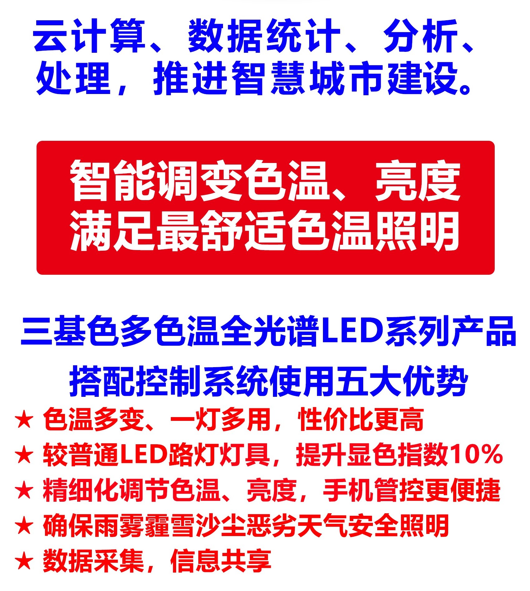 四、一盞三基色多色溫全光譜LED人工智能路燈色溫照明,可替代多盞普通單色溫LED路燈色溫照明,性價比更高,有效提高顯色指數(shù)、光效10%,色彩鮮艷度15%,燈具使用壽命更長。